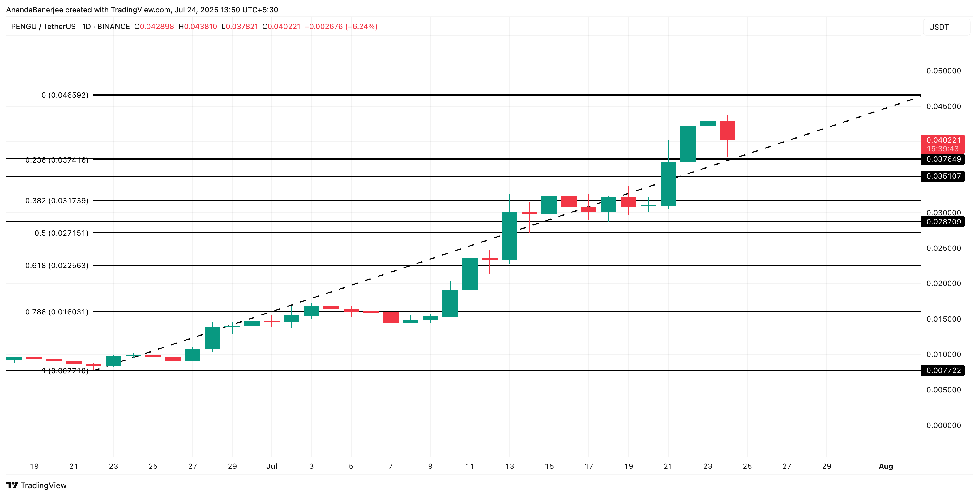 Tekniskt sett håller PENGU-priset precis ovanför ett viktigt stöd vid 0,037 USD, vilket stämmer överens med 0,236-nivån av Fibonacci retracement-indikatorn. Den är ritad från 0,0077 USD-lägsta till dess all-time high på 0,46 USD. 0,037 USD-nivån har sett uppgångar tidigare, men om den misslyckas, ligger nästa solida stöd nära 0,031 USD — 0,382 Fib-nivån.