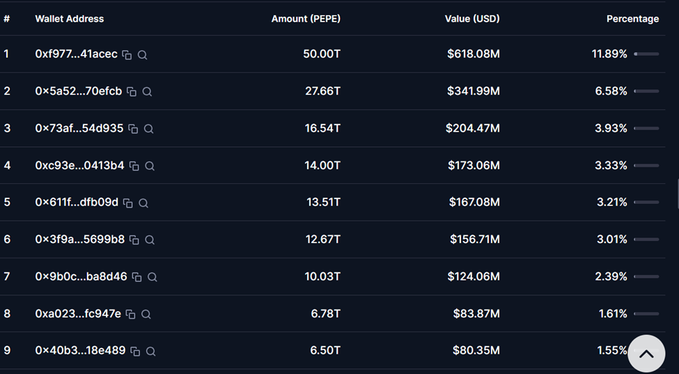 Samtidigt, även om sentimentet förbättras, kvarstår risker. On-chain-data avslöjar att de 10 största PEPE-plånböckerna kontrollerar över 37 % av tokenens utbud. Detta väcker oro för möjlig prismanipulation eller plötsliga försäljningar.