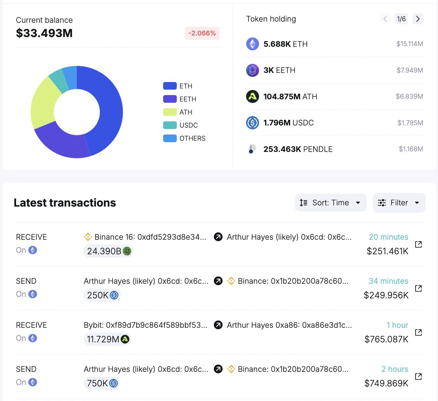 “Efter ATH vänder Arthur Hayes sig till att ackumulera meme-myntet PEPE! Under de senaste 2 timmarna deponerade Arthur Hayes 1 miljon USDC till Binance och drog tillbaka 24,39B PEPE (252 000 USD) till plånbok 0x6cd för första gången,” rapporterade Spotonchain .