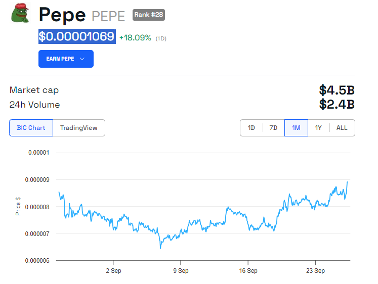 Under Hayes senaste köp har PEPE-myntet ökat med över 18% sedan fredagens session började, och handlas för 0,00001069 USD vid denna tidpunkt.