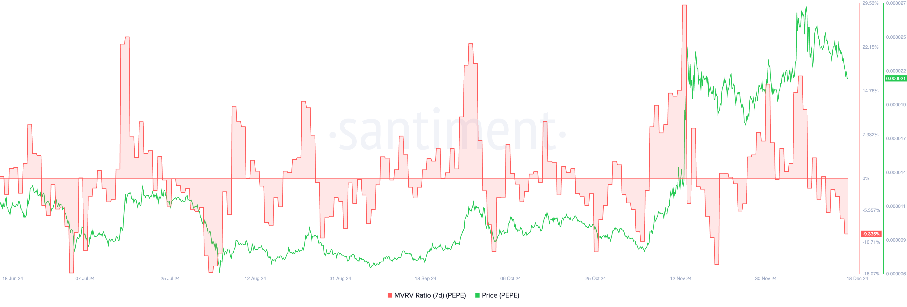 PEPE 7D MVRV Ratio är för närvarande på -9,3 %, en kraftig nedgång från 17 % den 8 december när priset nådde en ny högsta nivå. Denna negativa MVRV indikerar att kortsiktiga innehavare i genomsnitt nu har en orealiserad förlust. Den senaste nedgången återspeglar ökat säljtryck, vilket tyder på att den nuvarande korrigeringen kan fortsätta på kort sikt.