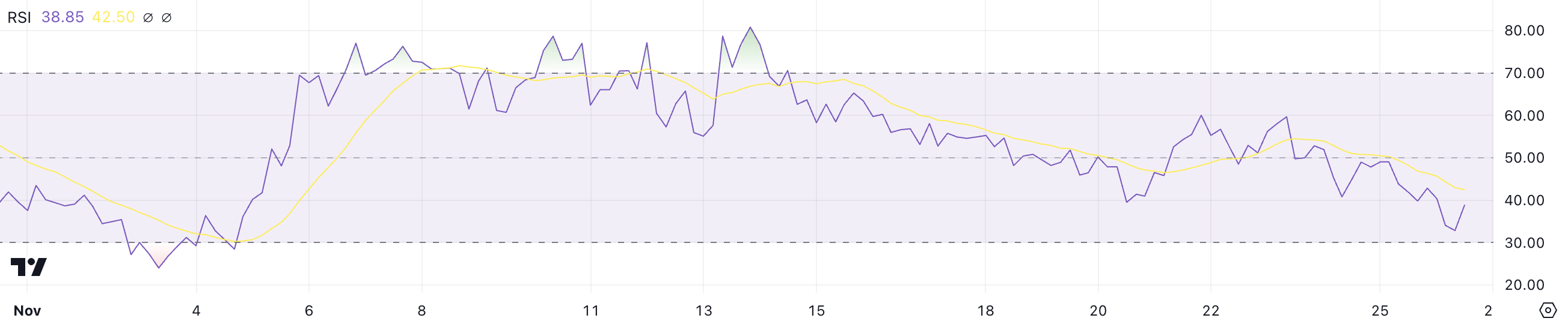 PEPE RSI har fallit till 38,8 från 60 de senaste tre dagarna, vilket indikerar försvagad positiv trend. RSI, eller Relative Strength Index, mäter prisets momentum på en skala från 0 till 100, där värden över 70 signalerar överköpta förhållanden och under 30 indikerar översålda nivåer.