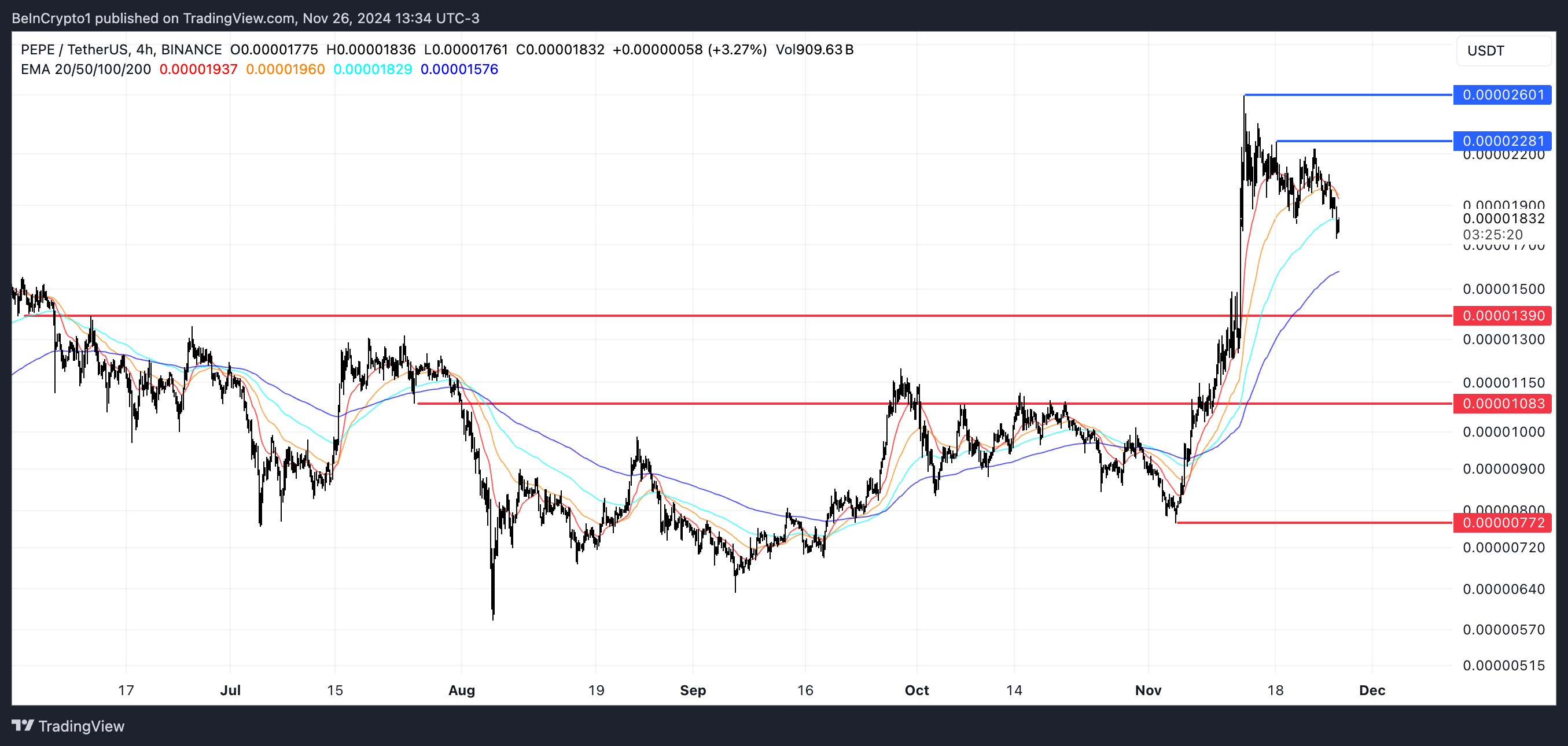 PEPE:s EMA-linjer visar en negativ signal, med ett potentiellt dödskors som bildas, där kortsiktiga EMA-linjer korsar under långsiktiga.