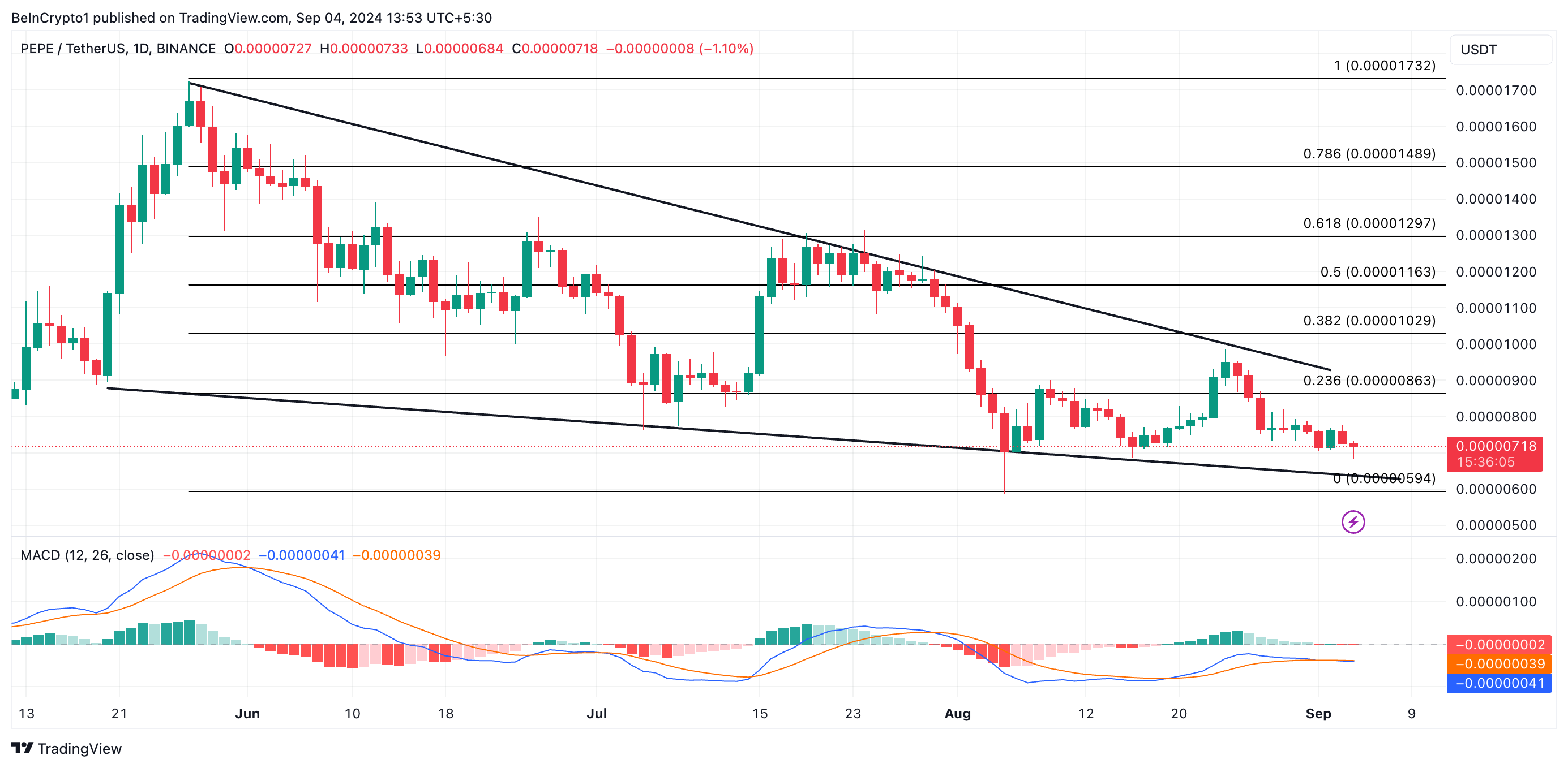 När MACD-linjen faller under signalinjen signalerar det ett försvagat momentum och en sannolik fortsättning på nedåtgående trend. Om detta mönster håller kan PEPE:s pris falla till den nedre gränsen av dess fallande kil vid 0,0000062 USD.