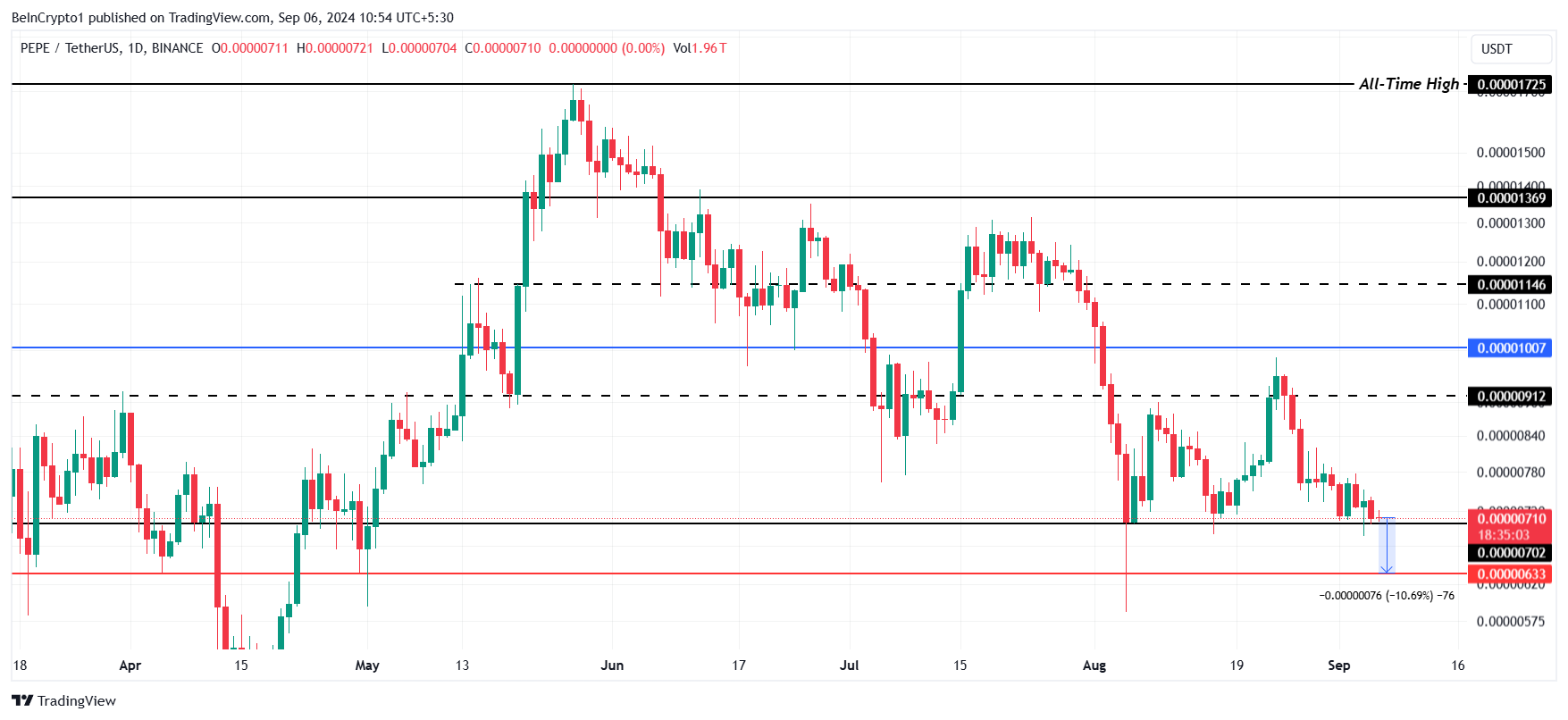PEPE-priset handlas för närvarande strax över sin kritiska stödnivå på 0,00000702 USD. Denna linje har fungerat som starkt stöd flera gånger under de senaste månaderna.