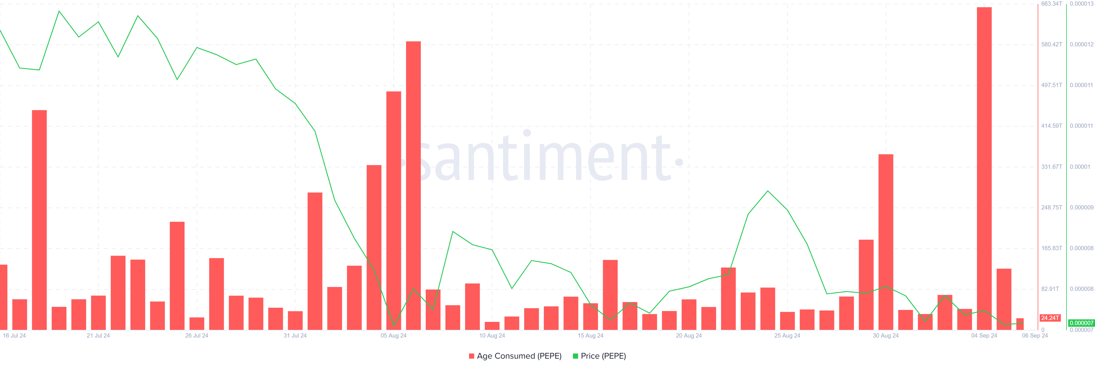 Måttet “ålder konsumerad” – en nyckelindikator som mäter långsiktiga innehavares aktivitet – nådde sin högsta nivå på två månader. Denna ökning tyder på att långsiktiga innehavare flyttar betydande delar av sina innehav. Vanligtvis är detta ett tecken på bristande tålamod och ökande oro för PEPE:s framtida prestation.