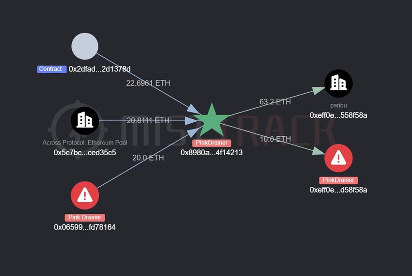 En adress kopplad till Pink Drainers blev offer för adressförgiftningsbedrägeri, enligt kryptospårningsverktyget MistTrack. I slutet av juni förlorade det ökända phishing-företaget 10 Ethereum (ETH), värderat till cirka 30 000 dollar, till en falsk plånboksadress.