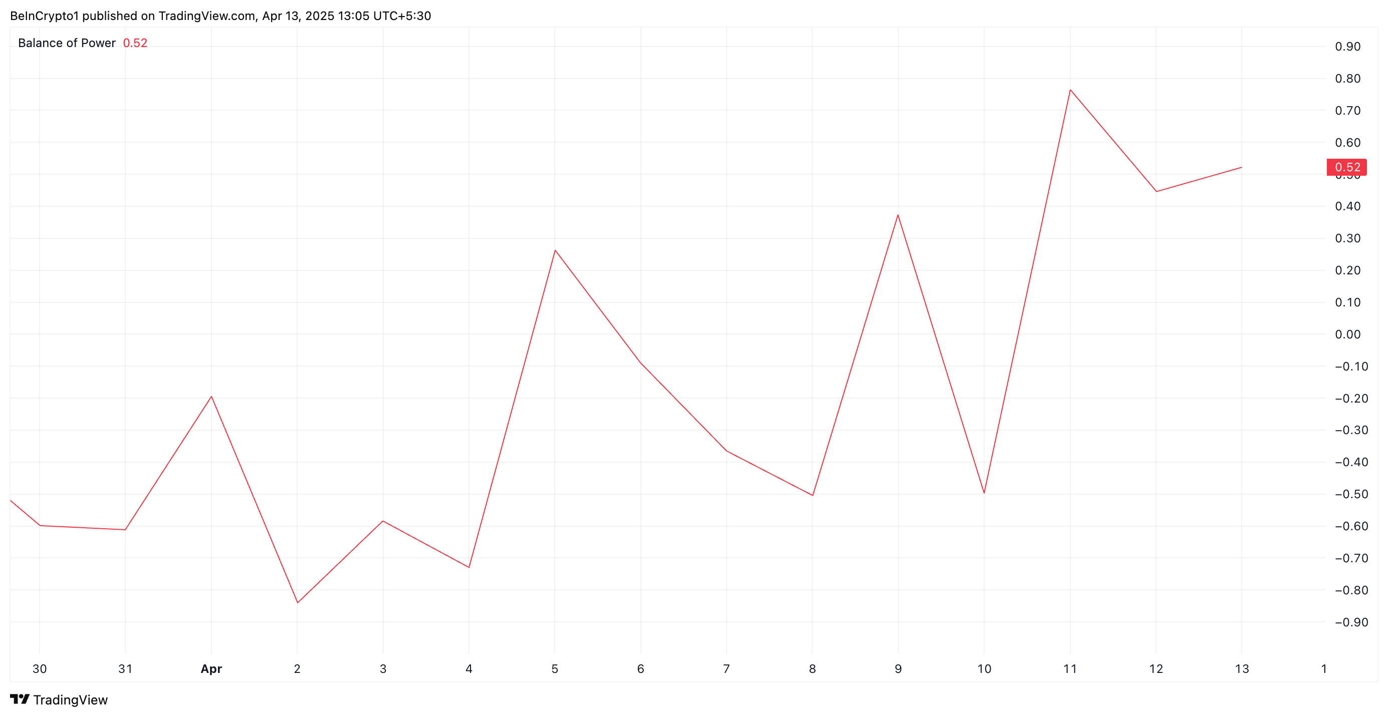 BoP-indikatorn mäter styrkan hos köpare jämfört med säljare på marknaden och hjälper till att identifiera momentumförändringar. När dess värde är positivt dominerar köpare marknaden över säljare och driver nya prisökningar.