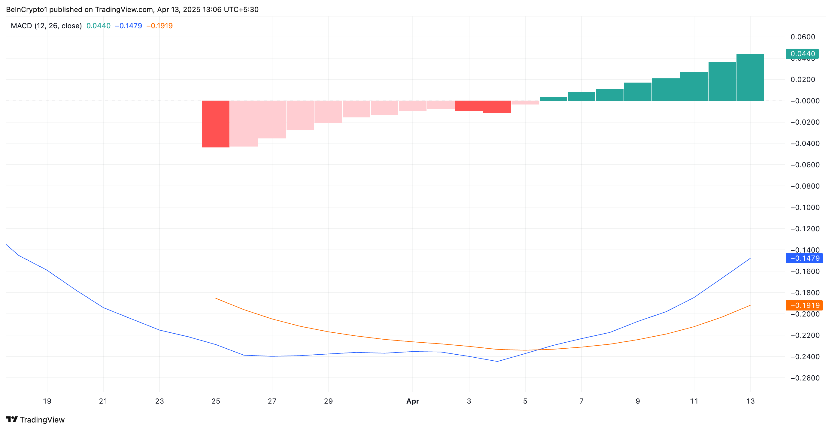 PIs Moving Average Convergence Divergence (MACD) indikator har gett en positiv signal. På dagsdiagrammet korsade MACD-linjen (blå) över signallinjen (orange) den 5 april, vilket indikerar en positiv förändring i momentum precis efter att den nådde botten på 0,40 USD.