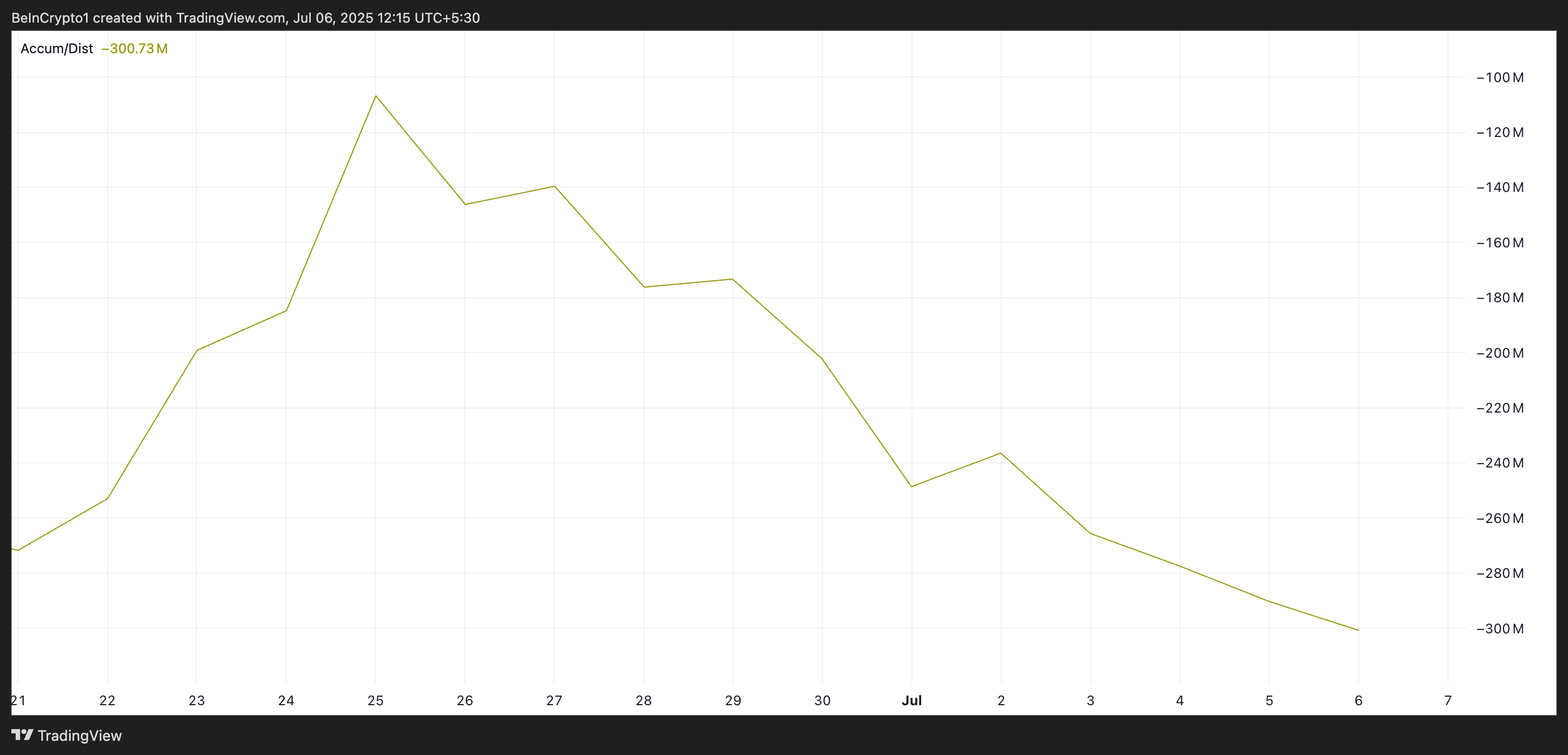 PIs ackumulations-/distributionslinje (A/D-linje) har sjunkit de senaste två veckorna, vilket signalerar en betydande minskning i köpevolym och minskat investerarförtroende. Vid skrivande stund är mätvärdet -300,73 miljoner, en minskning med 82 % sedan 25 juni.