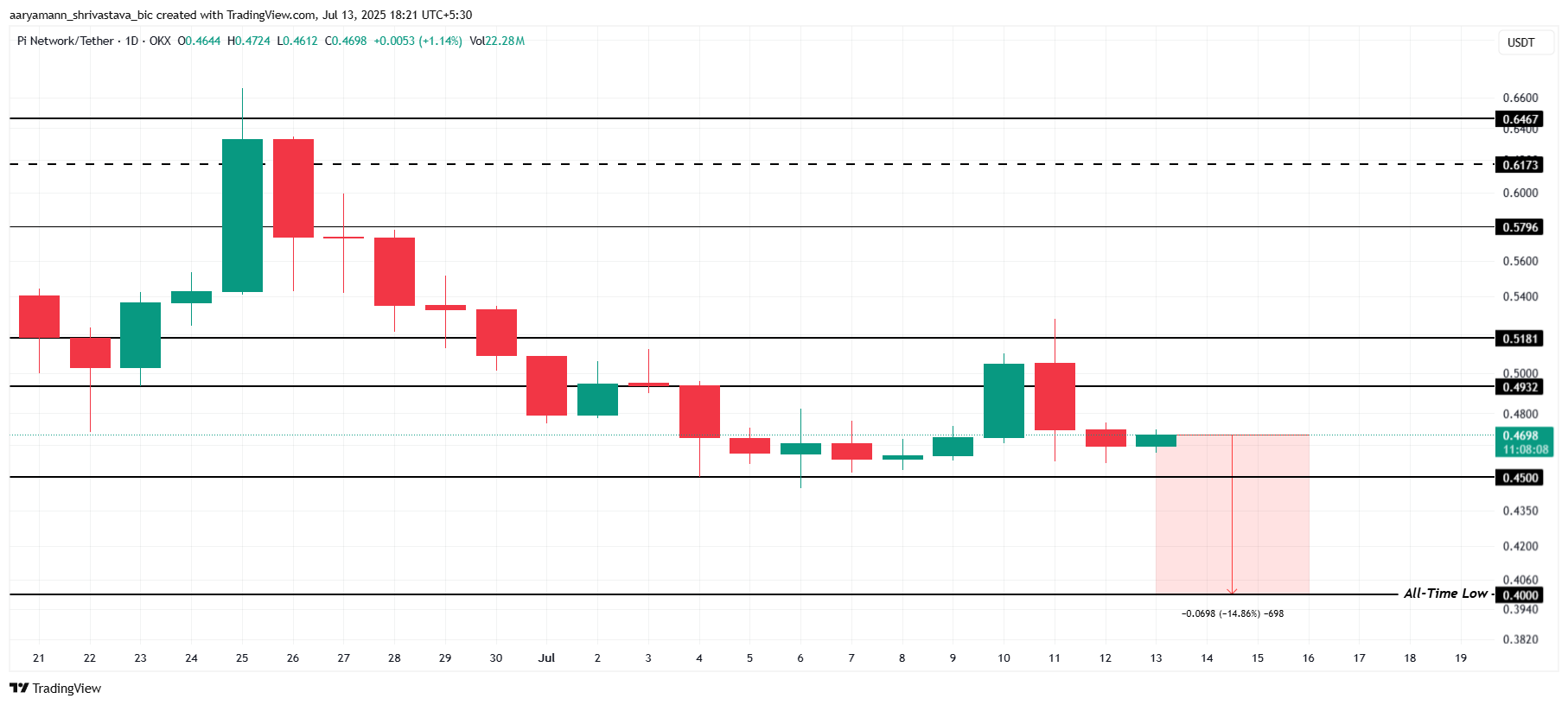 Pi Coins pris ligger nu på 0,469 USD, över den viktiga stödnivån på 0,450 USD. Men altcoinet är bara 14,8 % från att potentiellt nå sin lägsta nivå någonsin (ATL) på 0,400 USD. Om den nedåtgående pressen fortsätter kan Pi Coin lätt falla under detta stöd och återbesöka sin ATL.