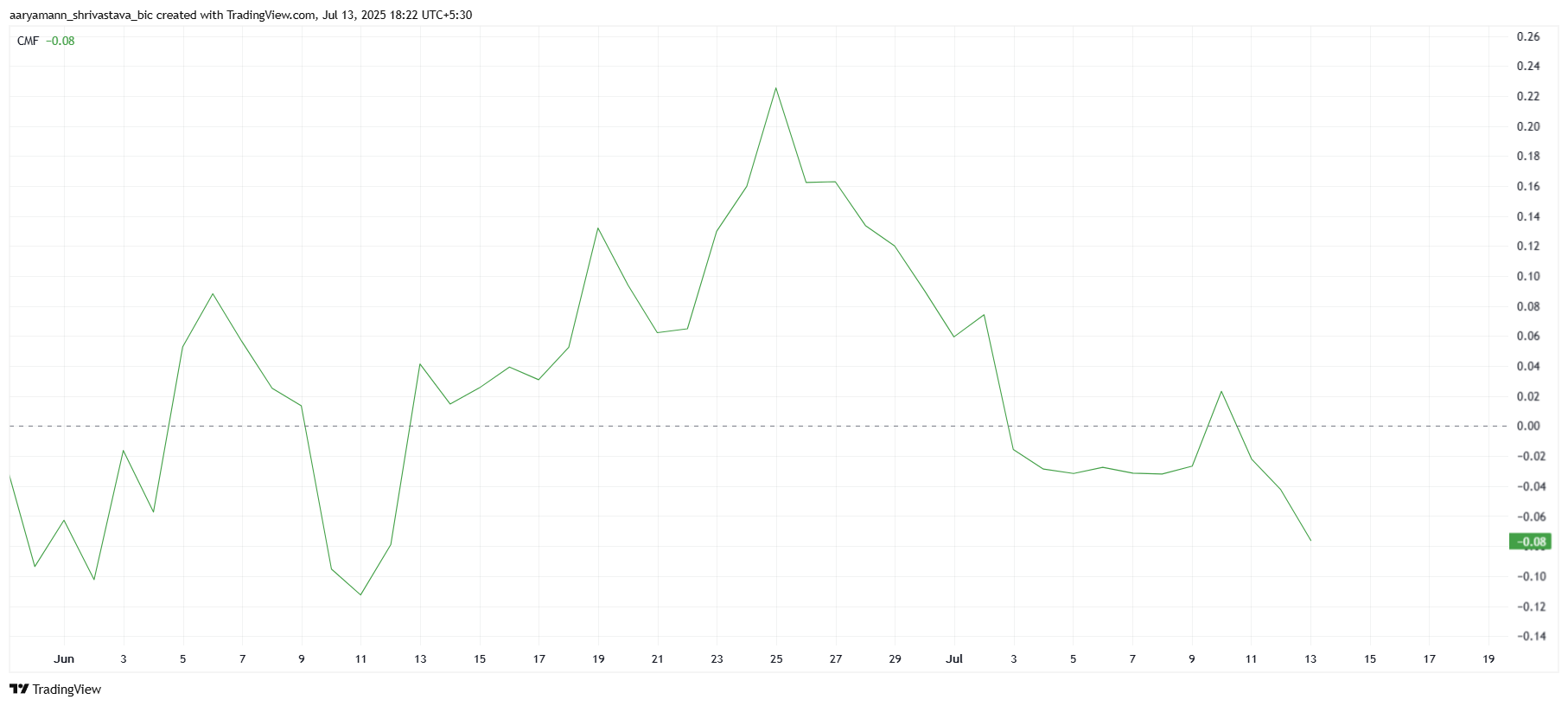 Chaikin Money Flow (CMF) för Pi Coin har minskat kraftigt och ligger nu under nollstrecket, vilket visar att utflöden dominerar inflöden.