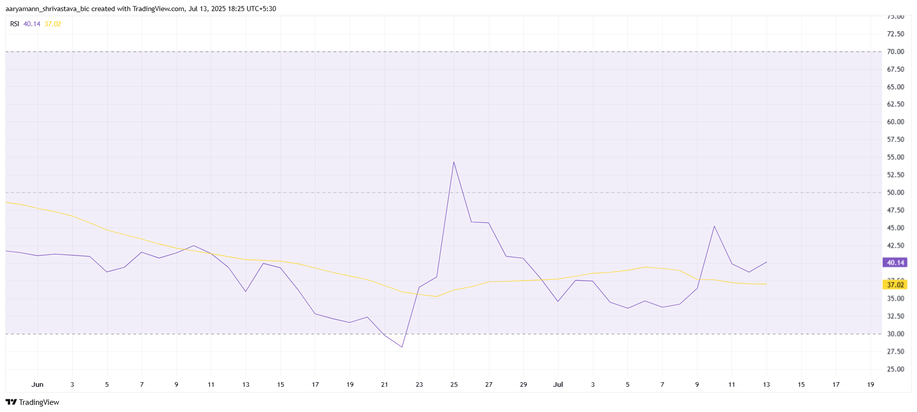 Pi Coins bredare marknadsmomentum verkar också svagt. Relative Strength Index (RSI) för Pi Coin ligger nu under neutral nivå, vilket indikerar att altcoinets momentum är negativt.