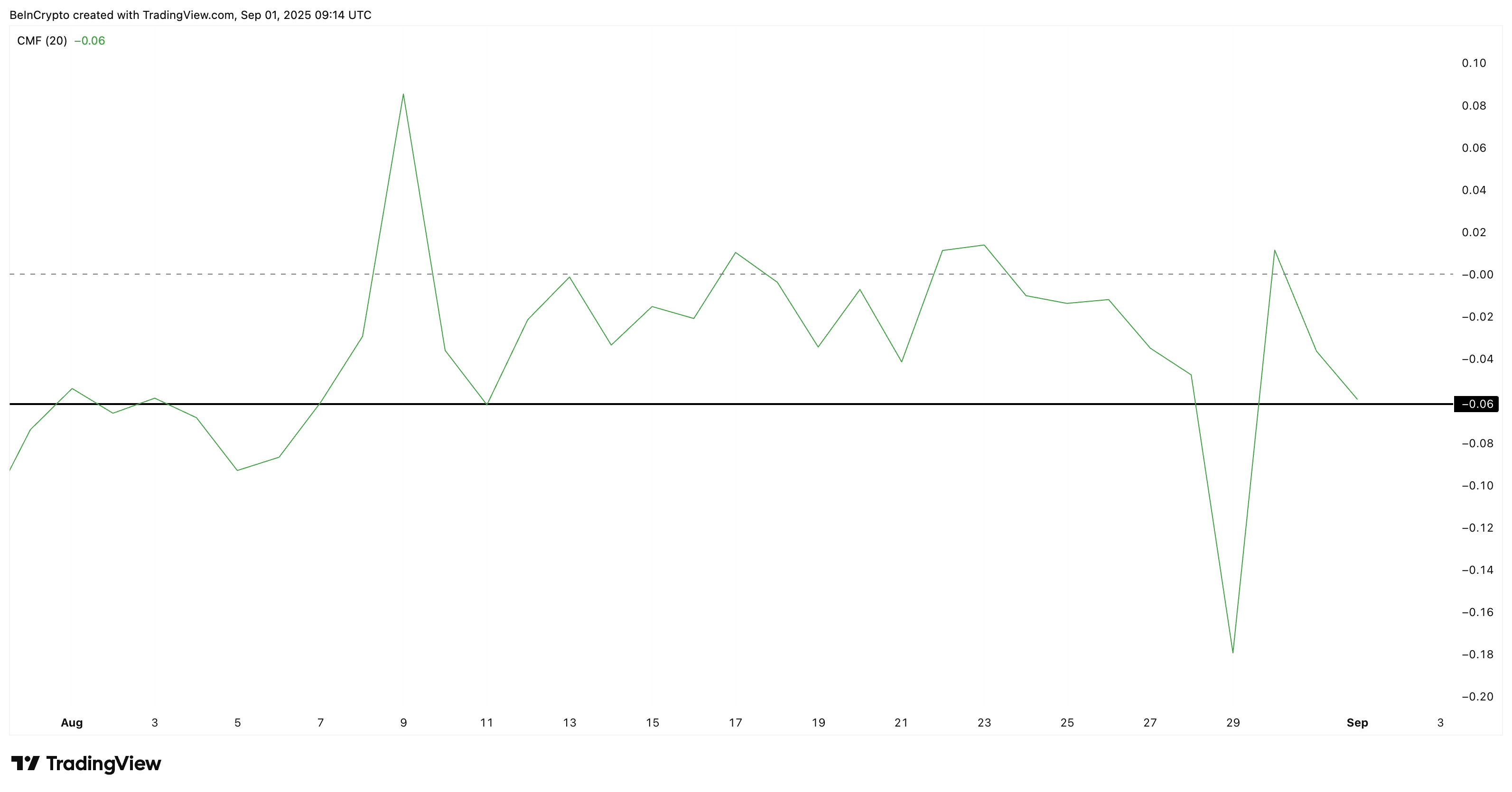 Men nu har det sjunkit till -0,06, nära den låga nivån den 11 augusti, vilket signalerar att kapitalinflöden har torkat upp och säljare tar kontroll igen.