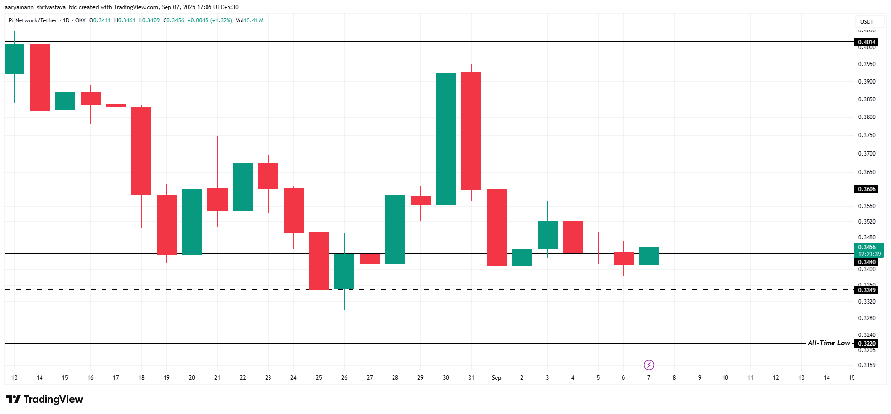 Om stödet misslyckas kan Pi Coins pris glida genom 0,334 USD och falla mot sin lägsta nivå någonsin på 0,322 USD. Ett brott under den punkten kan öppna för ytterligare nedåttryck och potentiellt nya rekordlåga nivåer.