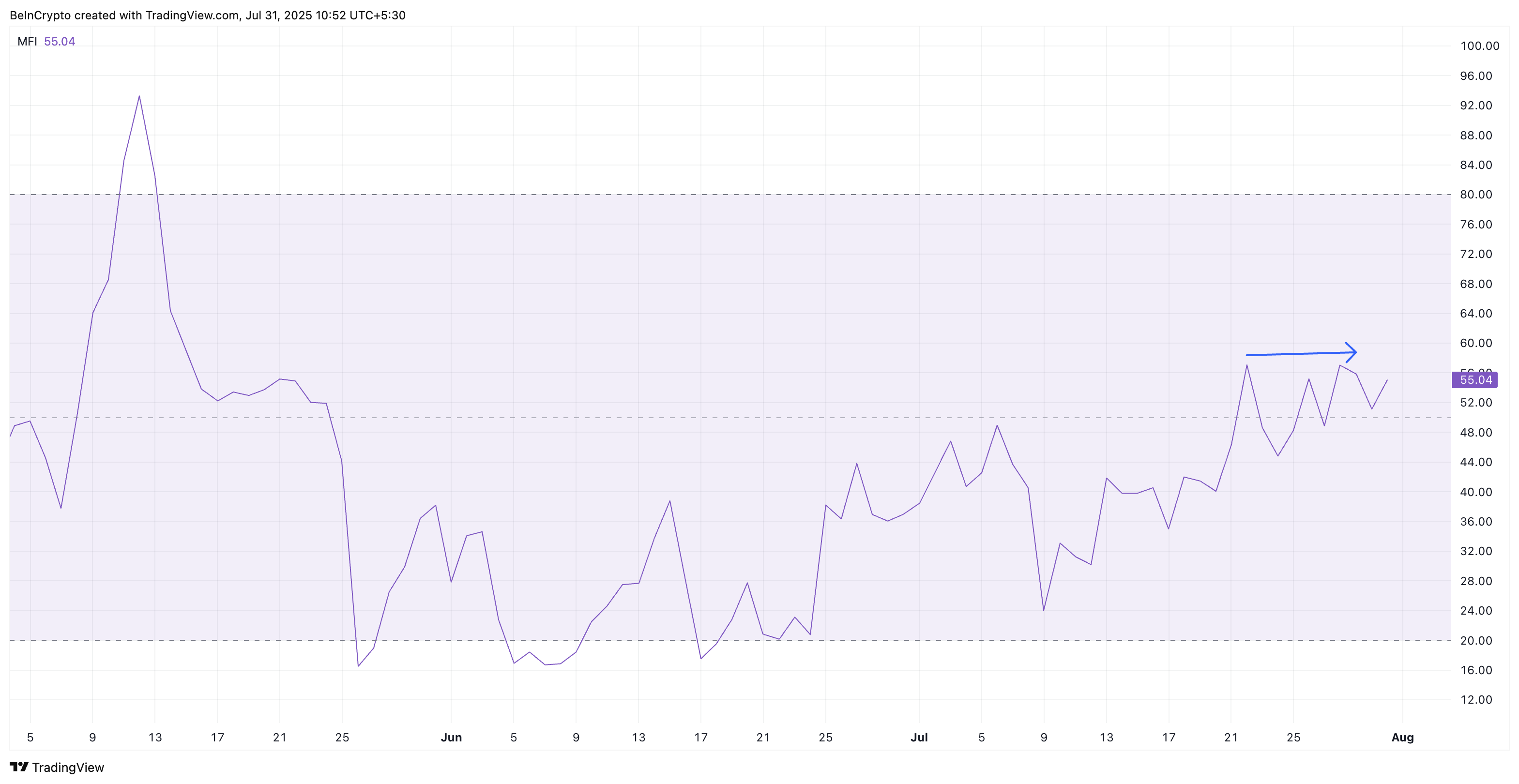 Money Flow Index (MFI) berättar en liknande historia. Denna indikator kombinerar pris och volym för att visa om pengar flödar in eller ut ur en token.