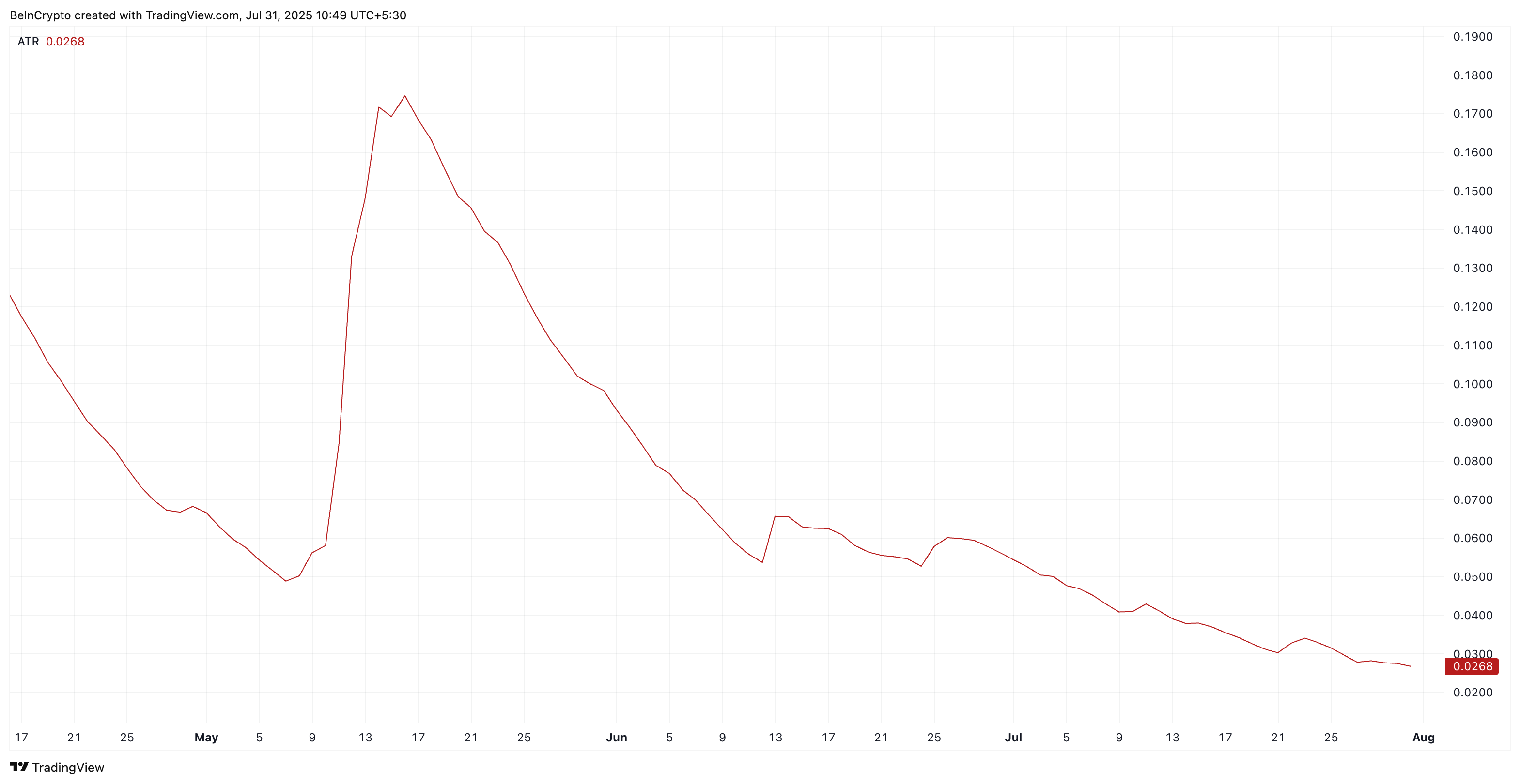 Den första varningssignalen kommer från Average True Range (ATR), ett verktyg som mäter hur stora prisrörelser är. När Pi Coin nådde toppar nära 1,66 USD i maj, var ATR på 0,17, vilket signalerade starkt momentum och aktiv handel.