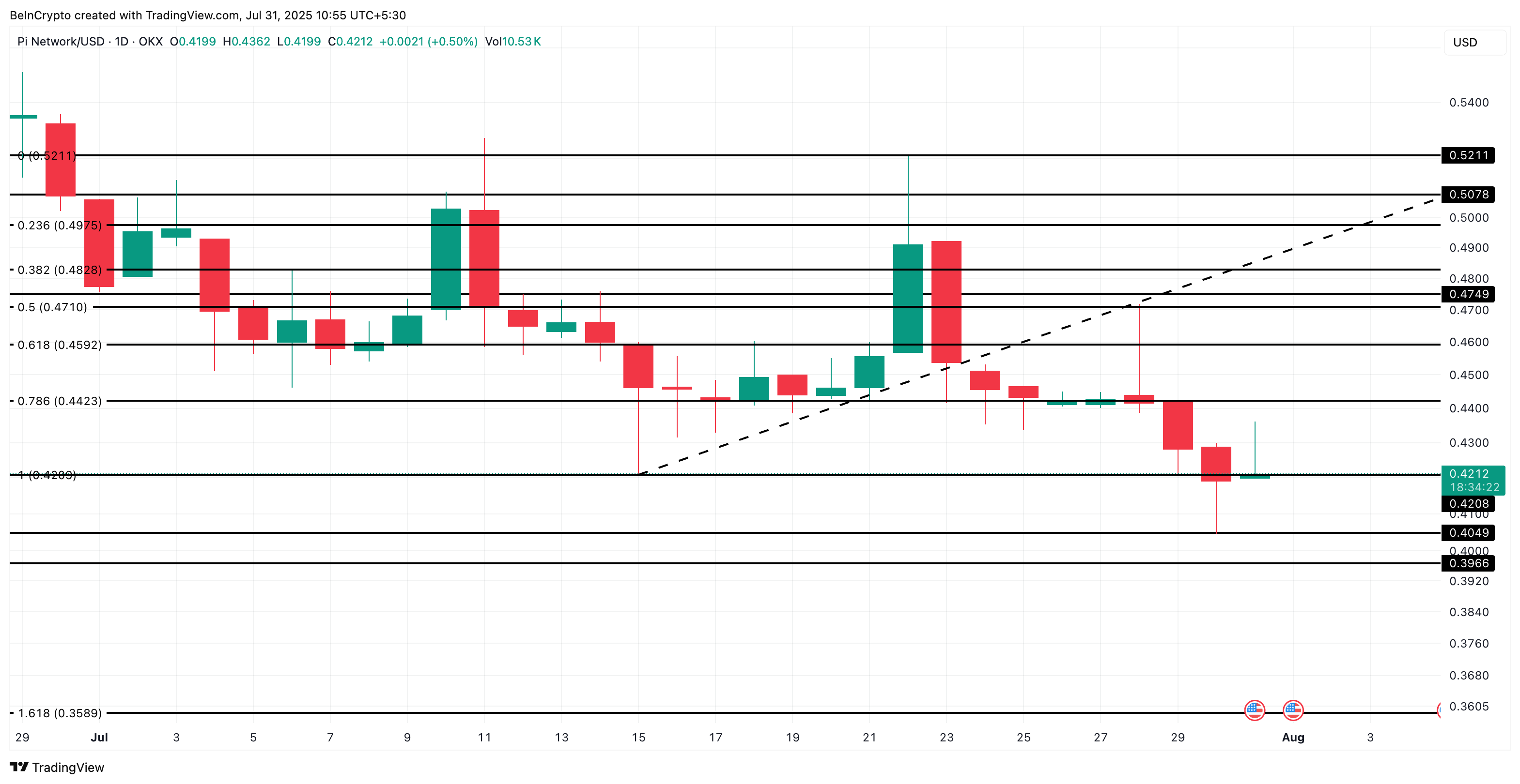 På diagrammet är Pi Coin fast i en fallande triangel, ett baisseartat mönster där lägre toppar fortsätter att trycka mot en bräcklig stödnivå. För tillfället ligger det omedelbara stödet vid 0,42 USD och 0,40 USD, och det ser allt mer sannolikt ut att brytas med inte mycket kapital som används.