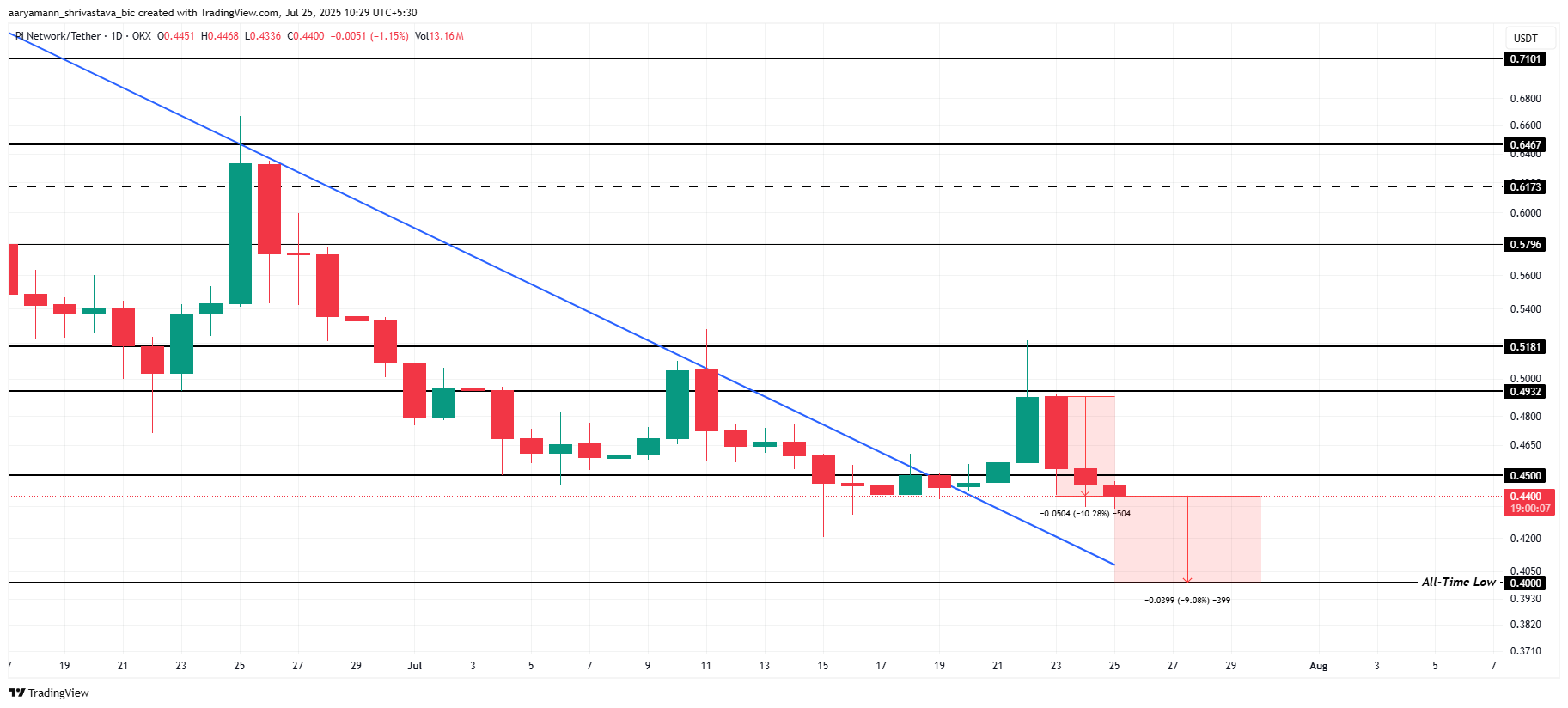 Pi Coins pris ligger för närvarande på 0,44 USD, bara 9 % från dess lägsta nivå någonsin (ATL) på 0,40 USD. Den senaste nedgången har pressat altcoin under stödet på 0,45 USD, vilket indikerar en svag position. Nästa stödnivå för Pi Coin är avgörande när den försöker hålla sig över sina nuvarande nivåer.