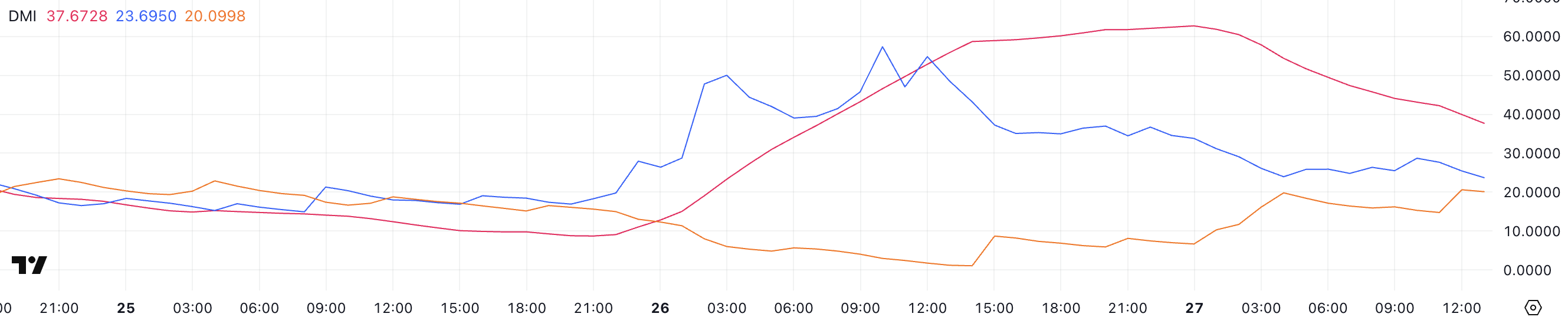 PI:s DMI-diagram visar att dess ADX just nu är på 37,6, efter att ha stigit från 9 till 62,7 mellan igår och idag. Average Directional Index (ADX) mäter styrkan i en trend utan att ange dess riktning.