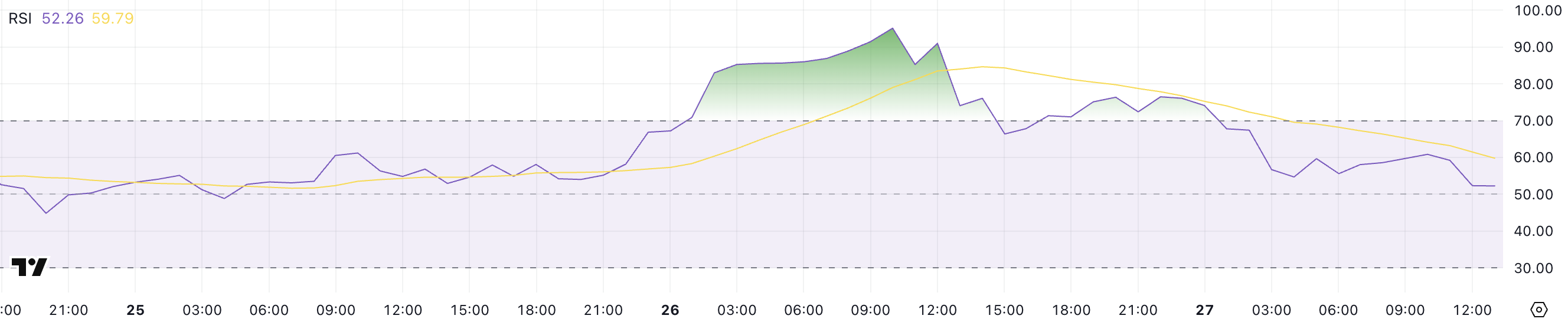 PI:s RSI är just nu på 52,2, efter att ha nått en extrem topp på 95 igår och hållit sig över 70 i flera timmar den 26 februari. Relative Strength Index (RSI) är en momentumoscillator som mäter hastigheten och förändringen av prisrörelser, och varierar från 0 till 100.