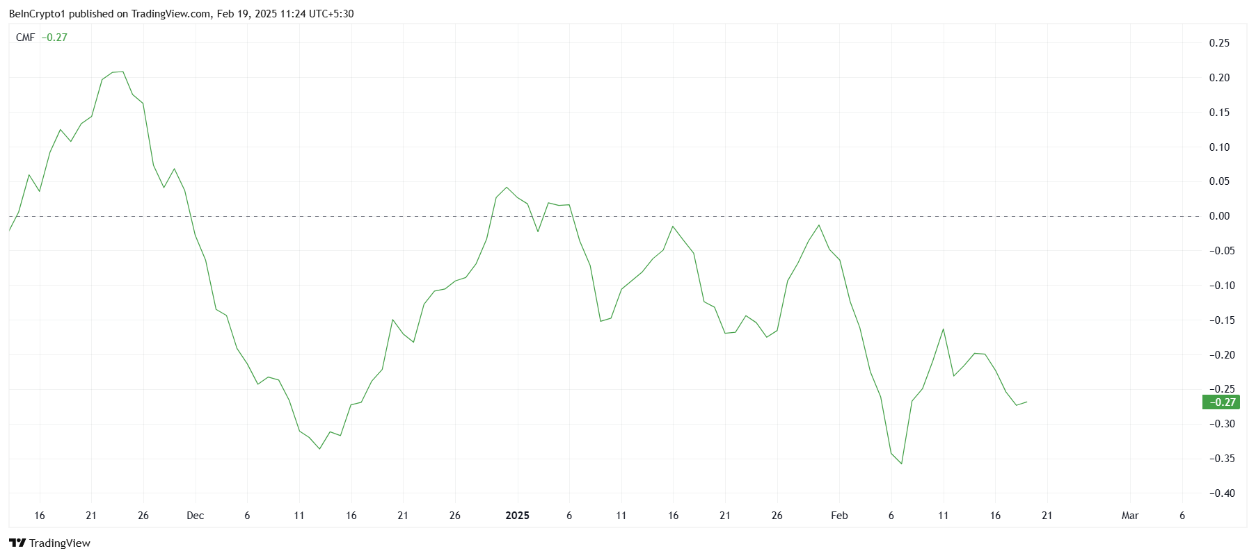 Chaikin Money Flow (CMF)-indikatorn, som mäter mängden pengar som flödar in i eller ut ur en tillgång, har varit på nedgång sedan månadens början. Trots några tillfälliga uppgångar har CMF misslyckats med att säkra nollinjen som stöd.