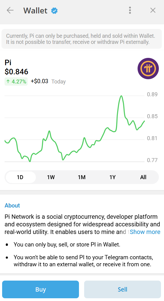 Detta innebär att Telegram-användare nu kan köpa PI genom appens integrerade kryptoplånbok. Även om det ökar tokenens synlighet, saknar Pi Network fortfarande listning från tier-1-börser som Binance och Coinbase, vilket skulle kunna förbättra dess trovärdighet på marknaden.