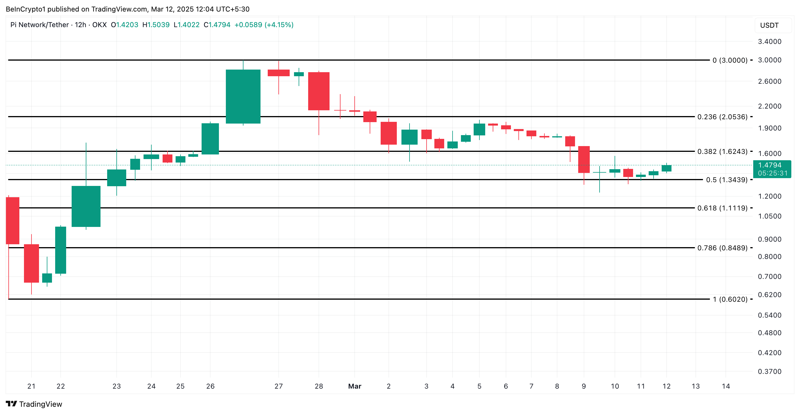 Pi Networks inhemska token, PI, har återhämtat sig efter några dagars nedgång. Den har ökat med 6 % de senaste 24 timmarna och handlas nu för 1,47 USD.