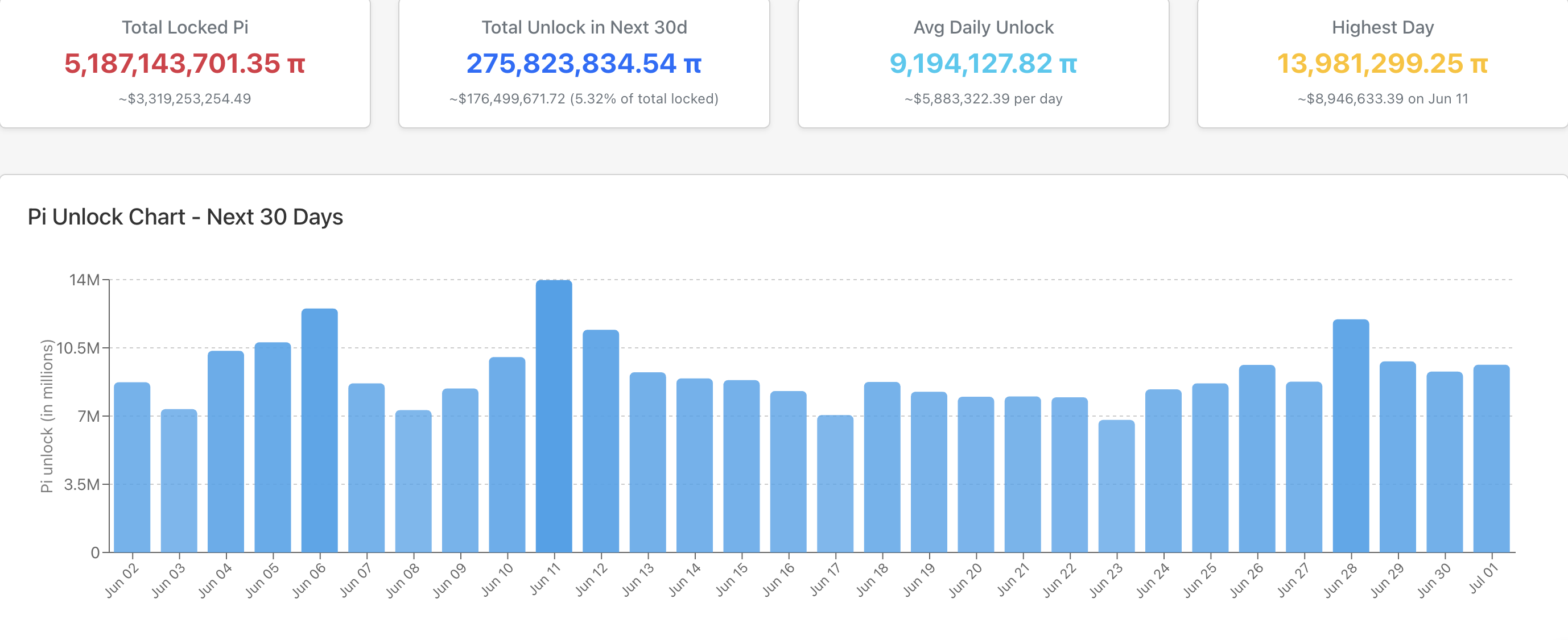 Enligt data från PiScan kommer Pi Network att låsa upp 276 miljoner PI-tokens i juni. Vid marknadspriser är dessa tokens värda cirka 176 miljoner USD.