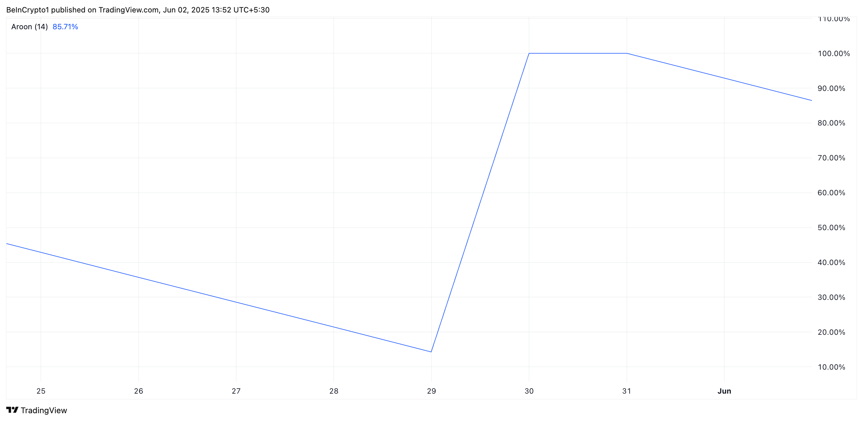 Vid 86 % signalerar Pis Aroon Down-nivå att tillgången har nått låga nivåer med hög frekvens, med få eller inga korrigeringar nyligen.