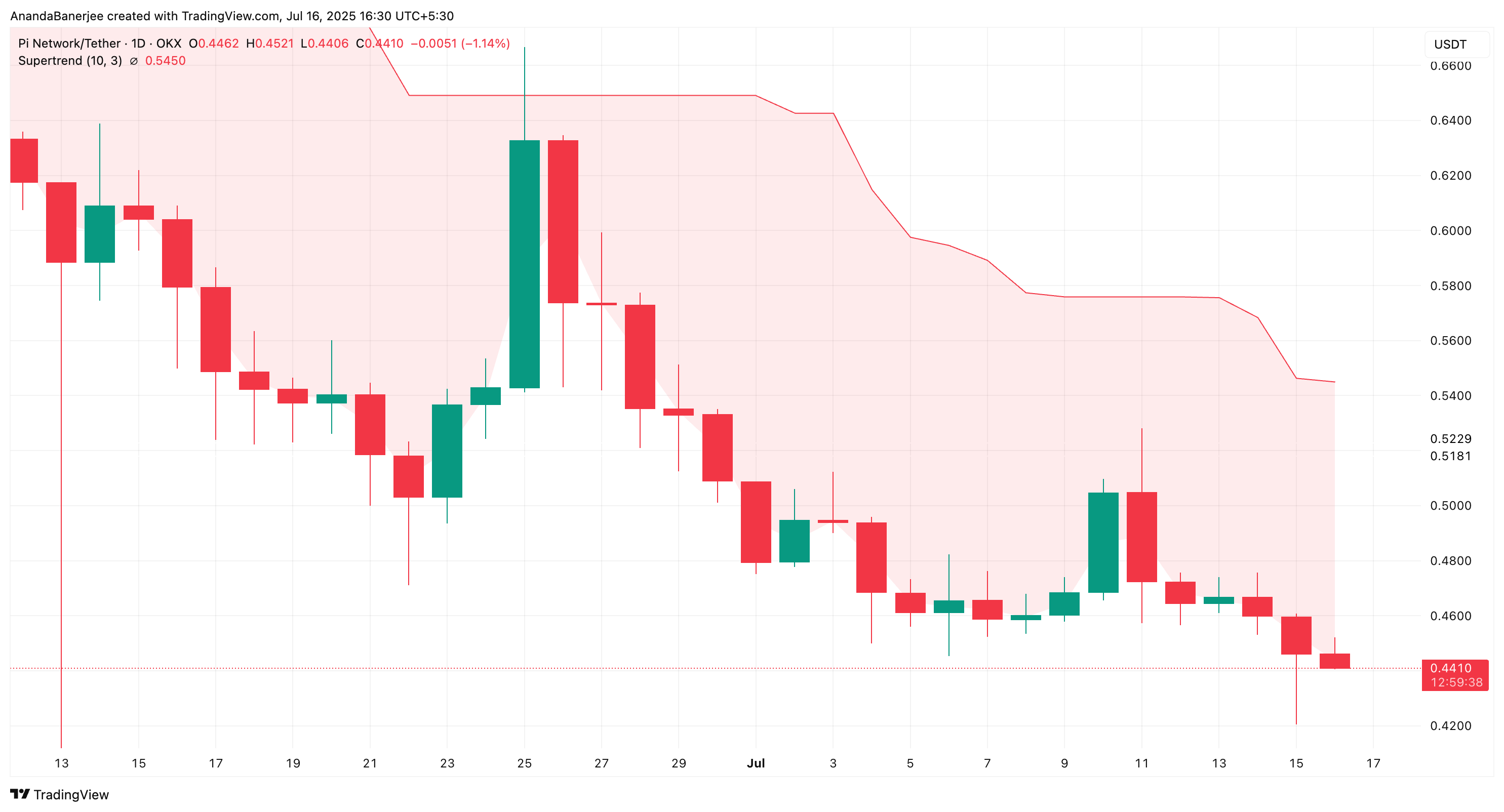 Pi Networks pris hänger på en tråd. Just nu handlas token strax över 0,44 USD, och risken finns att den faller 10 % till 0,40 USD-zonen.