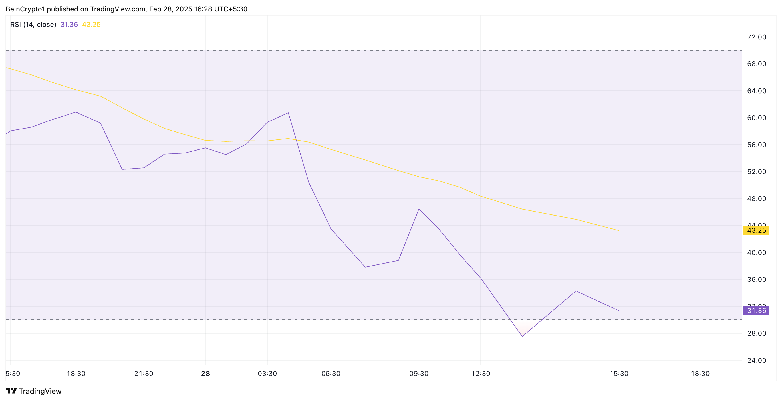 En tillgångs RSI mäter dess överköpta och översålda marknadsförhållanden. Det varierar mellan 0 och 100, där värden över 70 indikerar att tillgången är överköpt och kan behöva en korrigering. Å andra sidan, värden under 30 tyder på att tillgången är översåld och kan se en återhämtning.