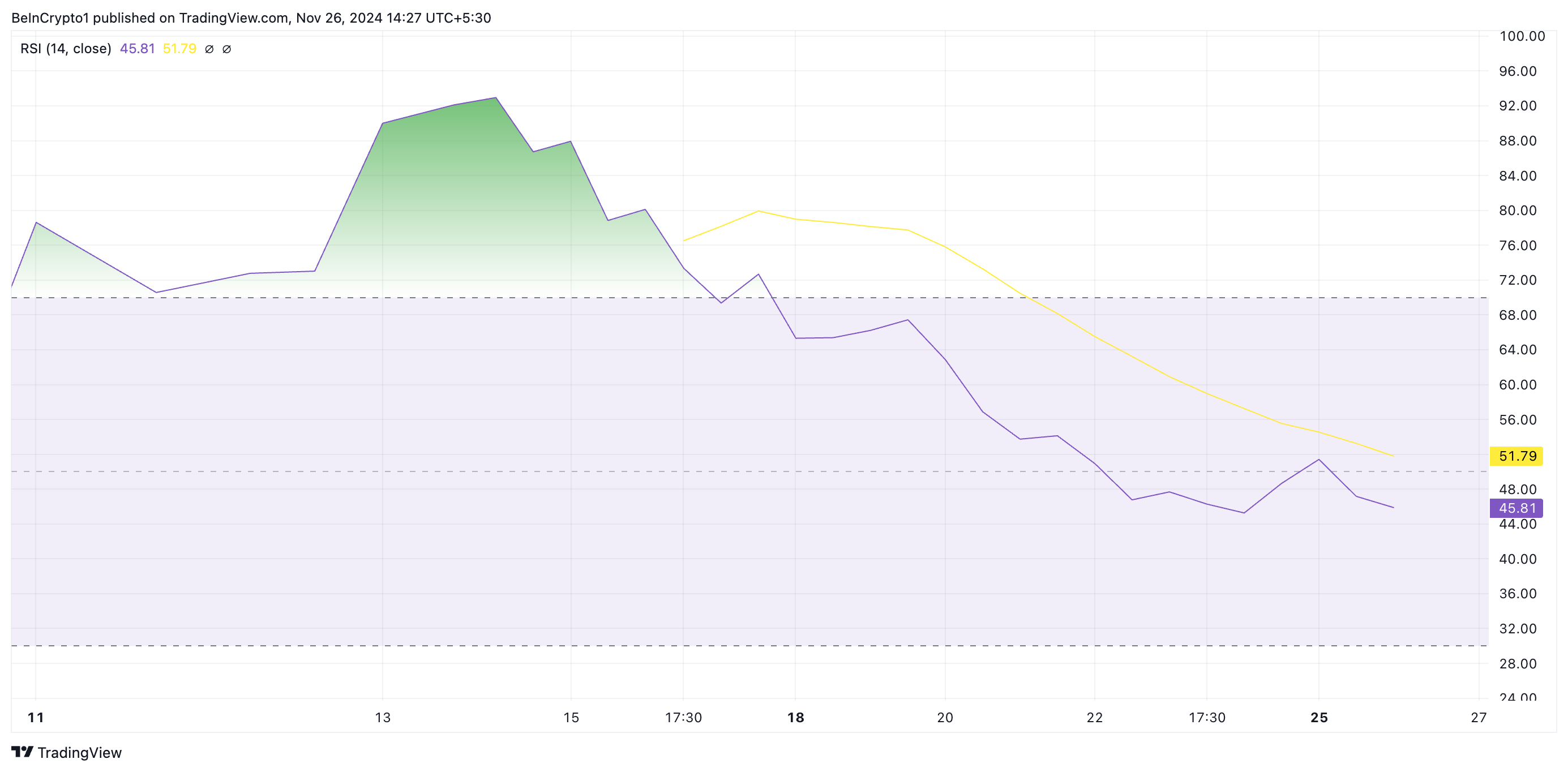 Vid 45,81 signalerar PNUT:s RSI en gradvis minskning i köpaktionen, vilket indikerar en potentiell fortsatt prisnedgång.