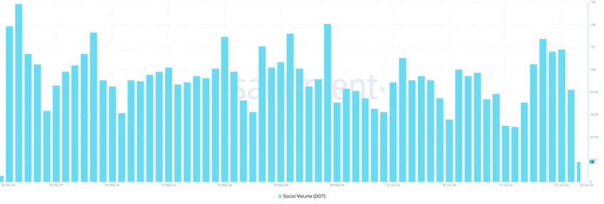 En annan indikator som driver den baisseartade förutsägelsen är Polkadots sociala volym. Social volym bygger på sociala data och mäter den hastighet med vilken marknadsaktörer söker efter en kryptovaluta.