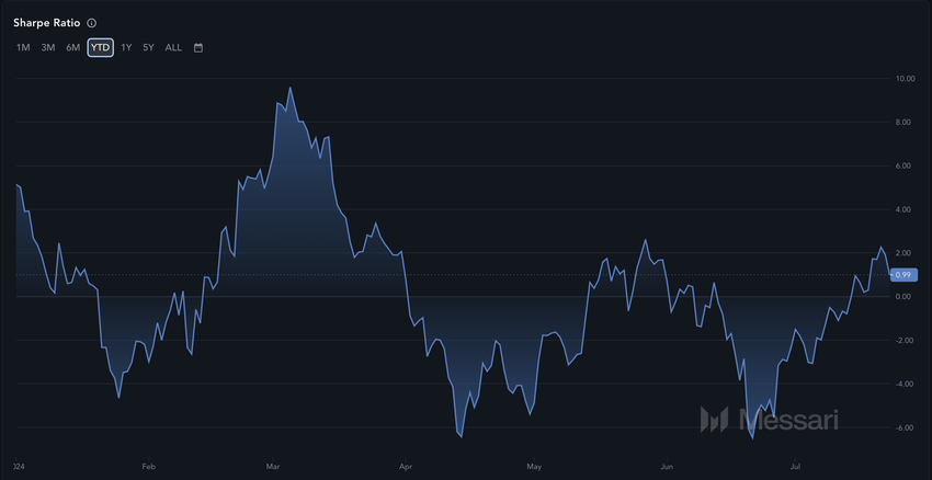 Enligt data från Messari är Polkadots Sharpe-kvot -0,99. Sharpekvoten mäter den riskjusterade avkastningen för en kryptovaluta.
