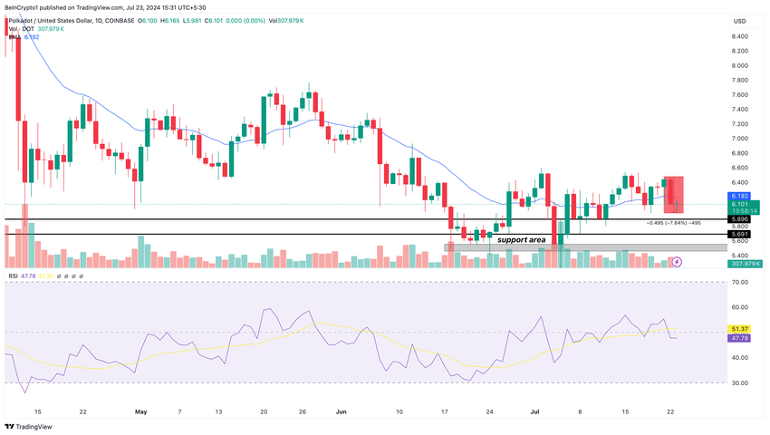 Baserat på det dagliga diagrammet var stödområdet runt $5,45 avgörande för DOT:s uppgång över $6. Tokenen stötte dock på en minskning med 7,64% efter att priset nådde $6,49 den 22 juli. Som ett resultat nådde DOT:s pris $5,96 innan den senaste återhämtningen.