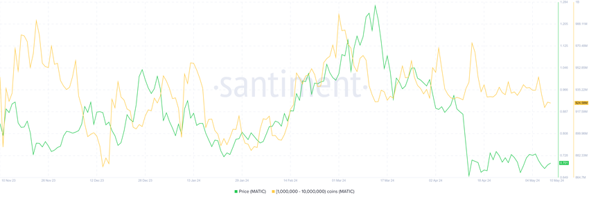 Eftersom Polygon-valar dominerar en betydande del av utbudet påverkar deras handlingar priset. Ackumulering inducerar återhämtning och rally medan försäljning leder till ett prisfall. MATIC-priset kommer sannolikt att bevittna samma resultat, eftersom valarnas utbud har sjunkit till en tremånaders låg.