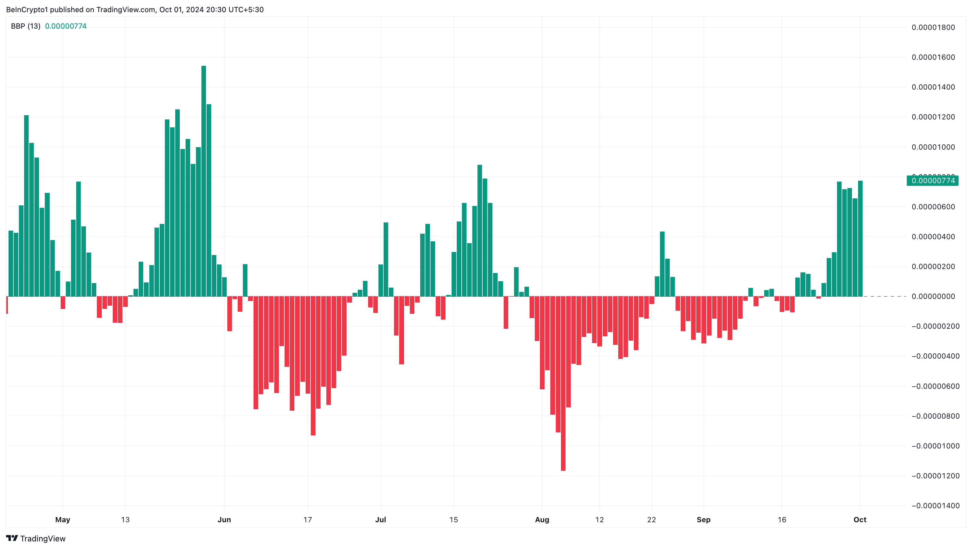 När BBP stiger, är tjurarna i kontroll, vilket indikerar att priset kan öka. Omvänt, om BBP är negativt, dominerar björnarna, och priset kan sjunka om det förstärks. På det dagliga diagrammet är BONK:s BBP positivt, vilket tyder på att priset kan stiga mycket högre än 0,000024 USD.