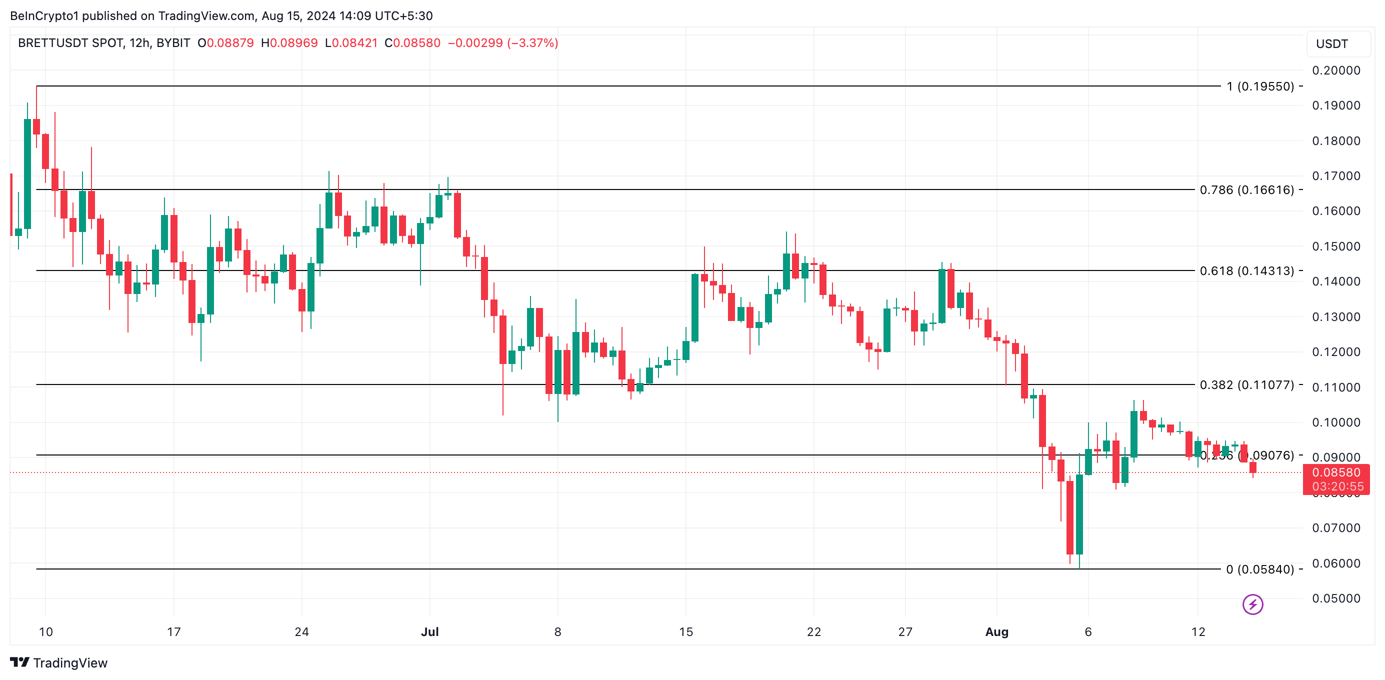 För närvarande handlas BRETT till 0,085 USD, vilket är en nästan 10% nedgång under de senaste 24 timmarna. Under samma tidsram nådde dess handelsvolym 19 miljoner USD, en ökning med 13%. Denna divergens mellan pris och volym antyder att innehavare säljer av sina positioner.