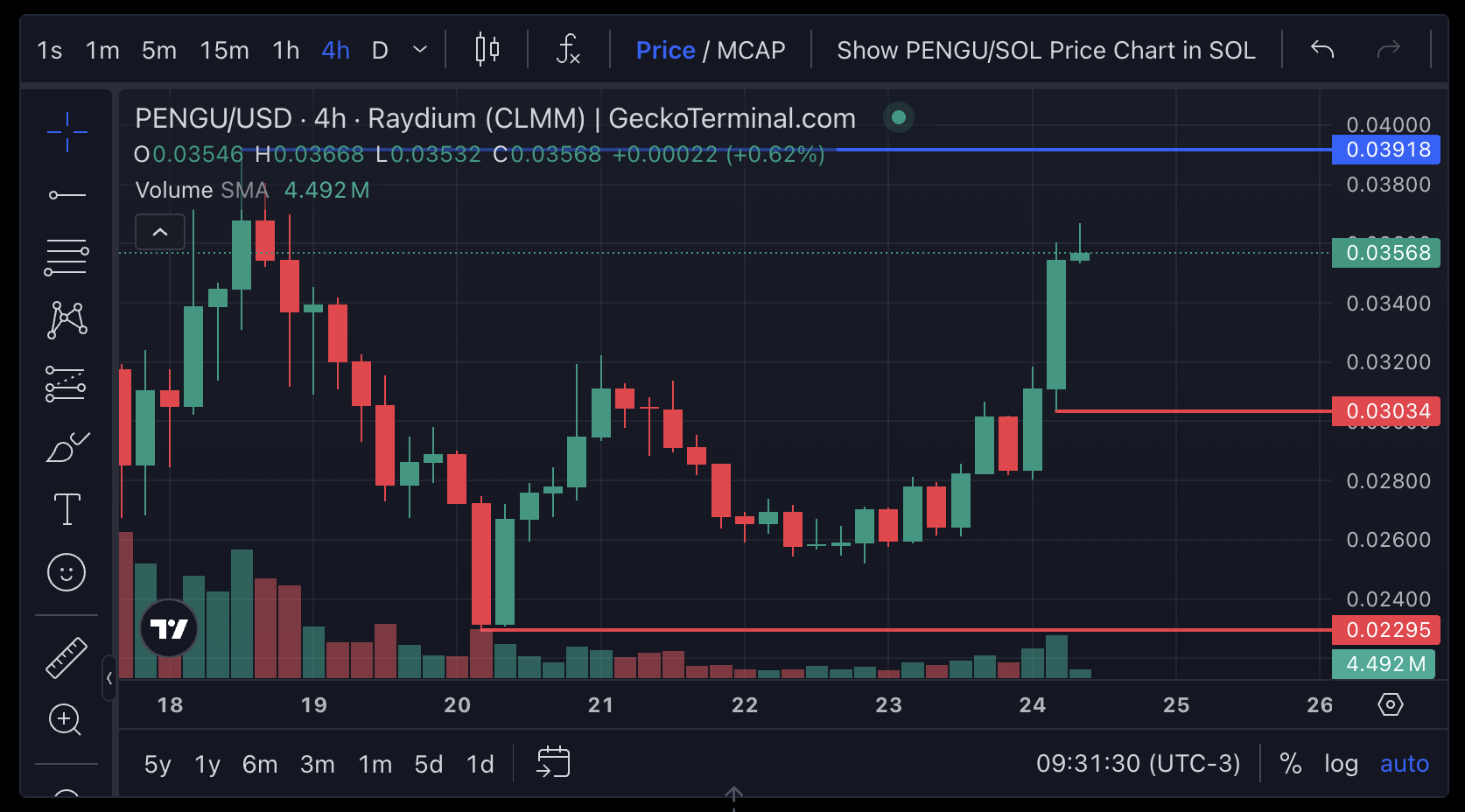 Om upptrenden fortsätter kan PENGU närma sig en ny rekordhög nivå på cirka 0,039 USD.