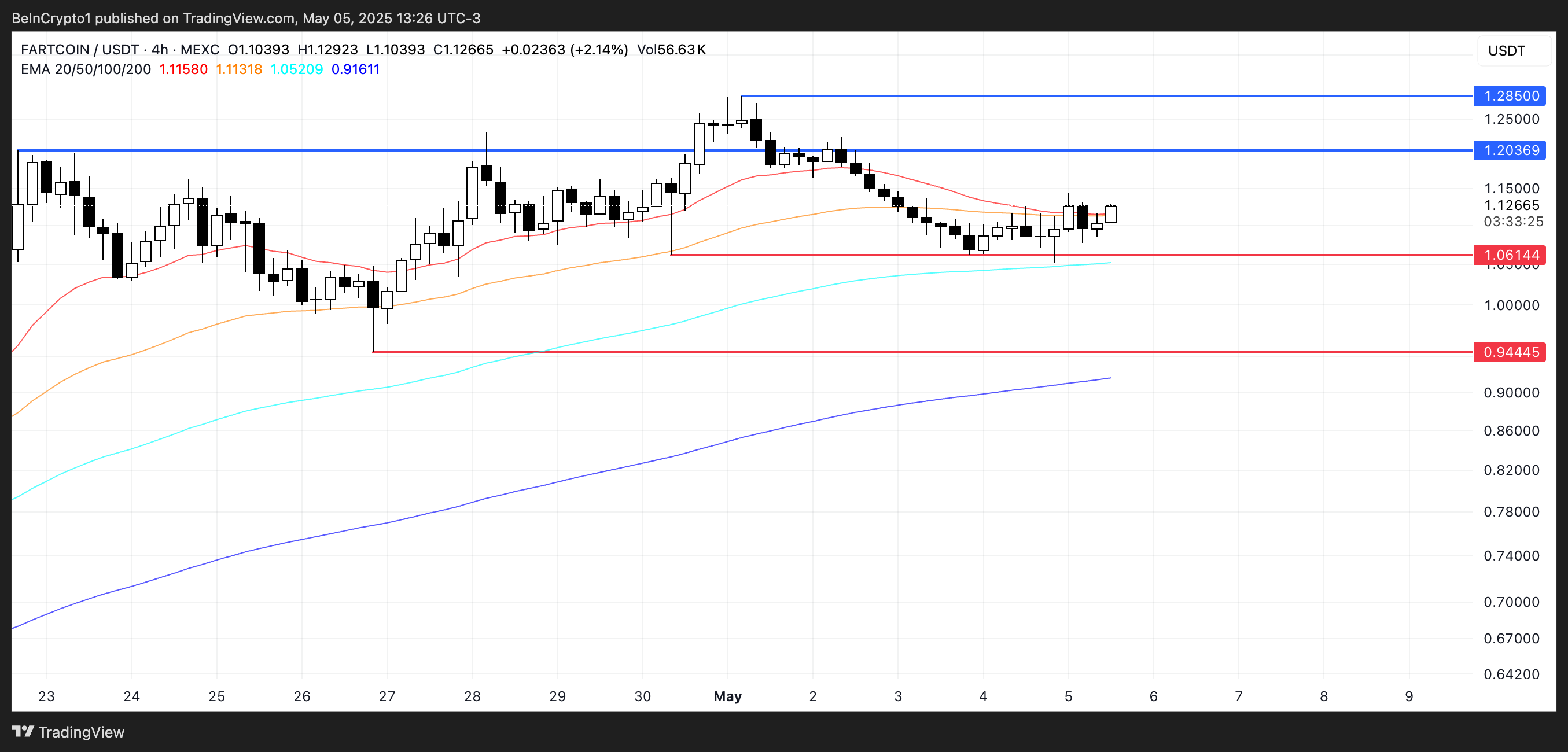 FARTCOIN närmar sig en viktig motståndszon vid 1,20 USD och 1,28 USD; om köparna kan bryta igenom kan en uppgång mot 1,60 USD följa.