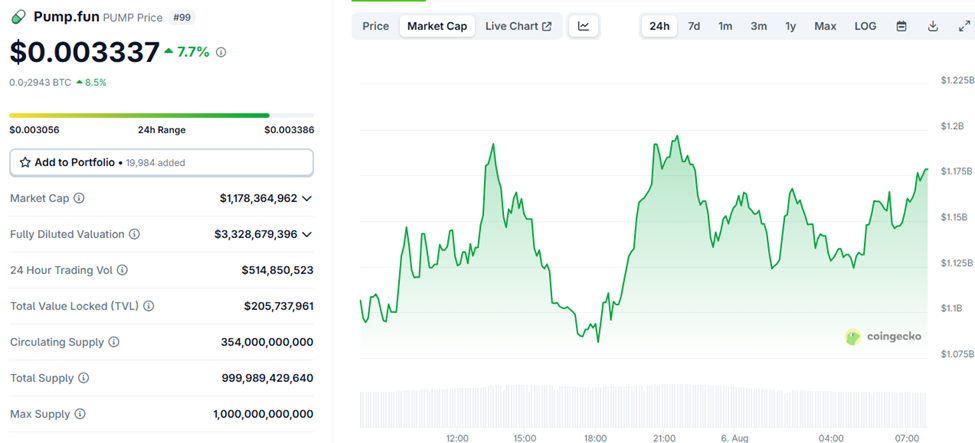 Meme-myntmarknadens värde har minskat med nästan 7 % de senaste 24 timmarna, vilket speglar den bredare marknadens känsla. Mitt i nedgången går Pump.fun-token, PUMP, mot strömmen och stiger med nästan 8 % under samma tidsperiod.