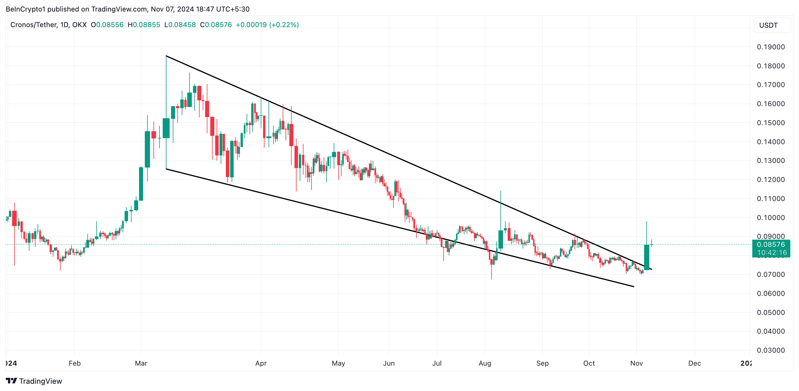 Cronos (CRO) har nyligen brutit ut från ett långvarigt fallande kil-mönster som den har handlats inom sedan den nådde sitt årshögsta på 0,18 USD den 5 mars.