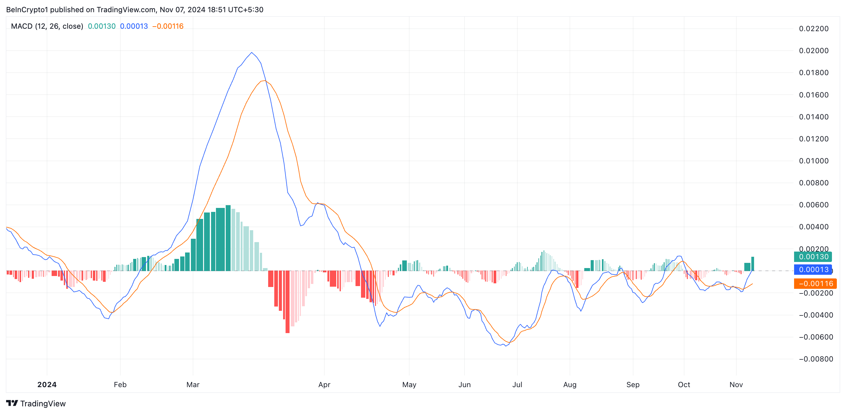 Det indikerar en potentiell uppåtgående trend i tillgångens pris. När den till slut korsar över nollinjen bekräftar det en hausseartad trend. Handlare ser detta som en stark köpsignal, eftersom det tyder på att priset sannolikt kommer att fortsätta röra sig uppåt.