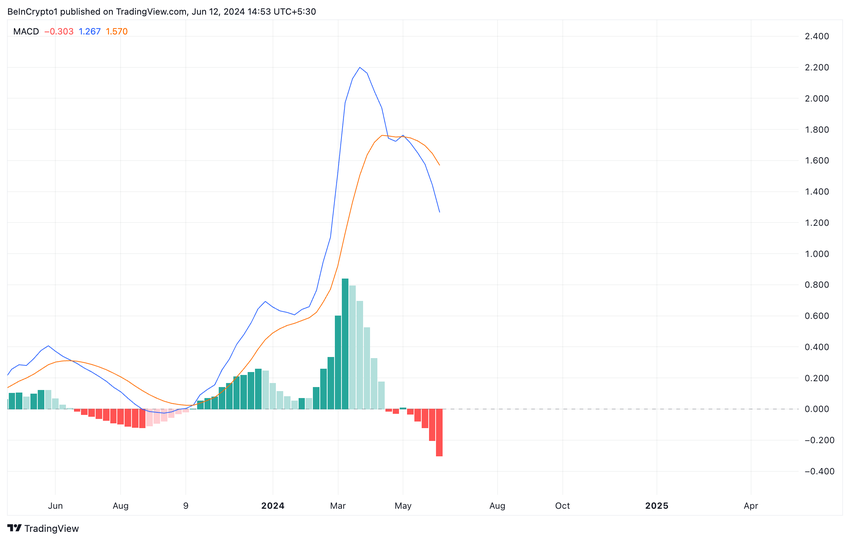 När detta skrivs visade RNDR:s Moving Average Convergence/Divergence (MACD) sin MACD-linje (orange) under sin signallinje (blå) och trendade mot nolllinjen.
