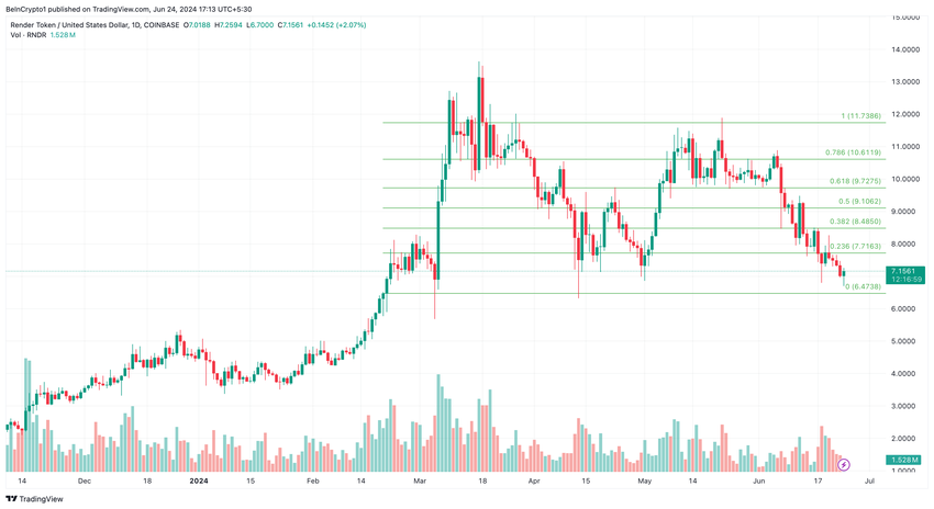 Förra veckan var Render (RNDR) en av de tokens med AI-tema som registrerade en anmärkningsvärd prisökning. Priset har dock sedan dess sjunkit från ett tak på 8,33 dollar och handlas för närvarande till 7,17 dollar.