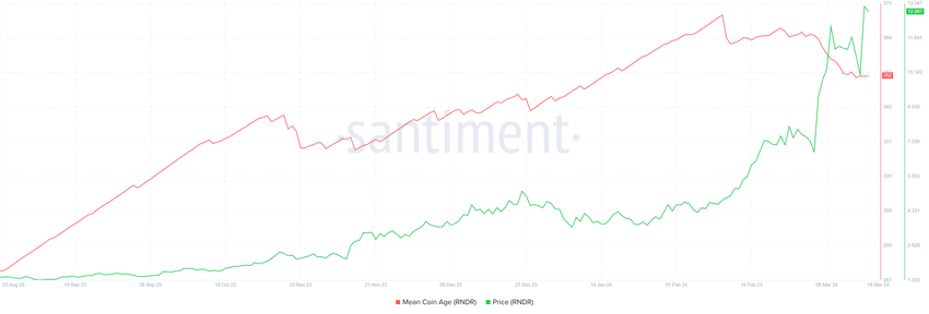 För det första har den genomsnittliga myntåldern (MCA) för Render-tokens minskat kraftigt. Detta är den största avvikelsen som noterats av mätningen på kedjan i altcoyns historia.