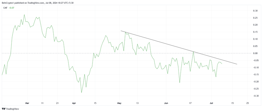 Renders Chaikin Money Flow (CMF) visar detta väl, eftersom det har fastnat i en nedåtgående trend under de senaste två månaderna. För närvarande ligger den under nolllinjen, vilket indikerar betydande utflöden. Detta innebär vanligtvis en ökning av säljtrycket.