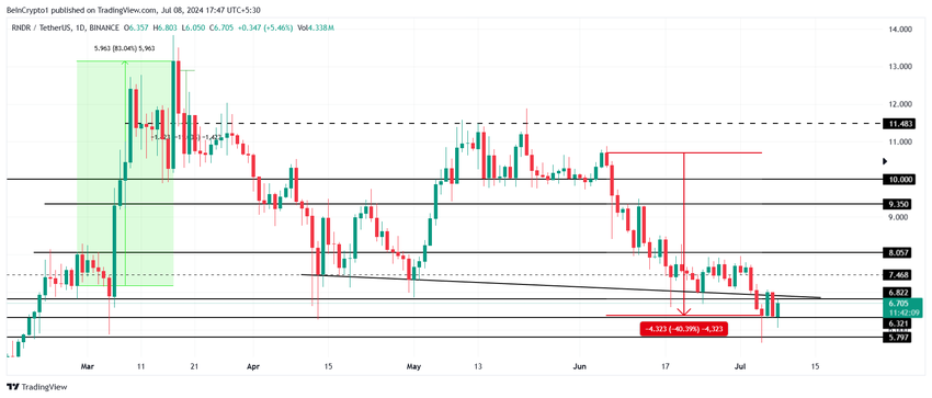 Renders pris har sjunkit med 40% under de senaste dagarna, vilket har ogiltigförklarat flera stödnivåer. Altcoinet har sjunkit från 11 till 6,7 dollar på en månad och stabiliserats över stödlinjen på 6,3 dollar.