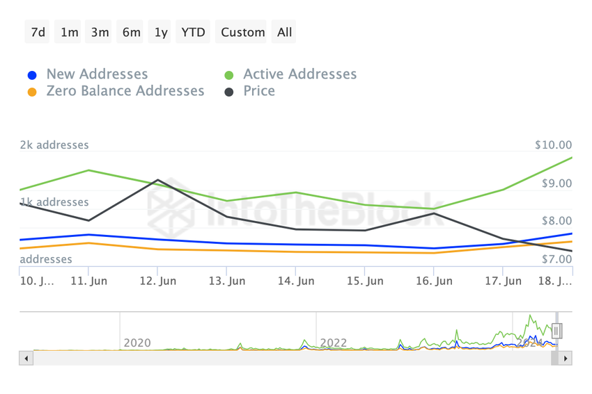 Ett annat lovande tecken är antalet nya adresser och nollbalansadresser. Nya adresser hjälper oss att förstå ett projekts tillväxt. När måttet ökar betyder det att deltagarna gör sin första transaktion i nätverket.